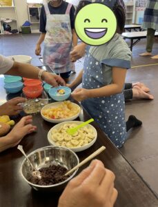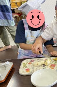 職員と一緒に包丁でフルーツを切る作業に挑戦したり、白玉団子をこねてみたり、全員で美味しいフルーツポンチを作って食べました。