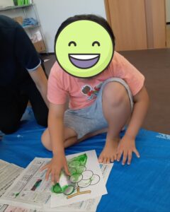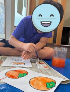 秋の味覚のぶどう、柿、栗などの絵を絵具で塗って製作しました。