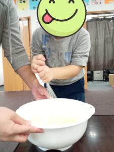 蒸したカボチャを混ぜて、パンケーキを子どもたちと一緒に作りました。