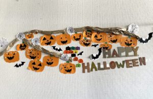 10月の壁面は、子どもたちみんなでカボチャおばけを作成!